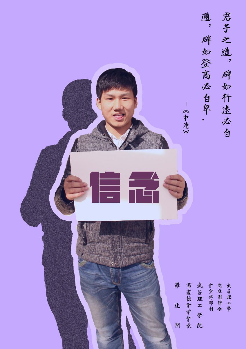 团委网5月11日消息(王彬霞 王荟桢 报道)他,信息工程学院,自动化1201班的学生,现任书法协会会长。他坚信“只有长期的坚持,才能在自己的领域有所收获”。当年,齐白石每日坚持画虾,如今,他每日坚持练字。他说他对自己唯一的要求,仅是现在如此,日后亦如此。小小的坚持,往往是通往成功的必经之路,也正因心有乾坤,他才能凭借自己才华为协会出版一本自己编制的教科书。他就是武昌理工学院书画协会第六届会长--罗达文。