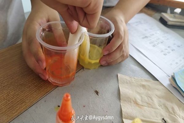 课程开始,雷静怡老师以悬念式问题引发同学关注:“大家知道怎么不用画笔将颜色传递到纸张上?”同学们都摇摇头。开始实验时,雷老师取出实验材料——透明杯子、清水、色素与纸巾,向杯中注入清水后,谨慎滴入数滴色素,清水即刻变为彩色溶液;接着将纸巾一端浸入水中,片刻后色素沿纸巾逐渐扩散,在纸上形成痕迹。在雷老师的引导下,孩子们依次动手操作,调配色素并放置纸巾,观察颜色蔓延的实验过程。