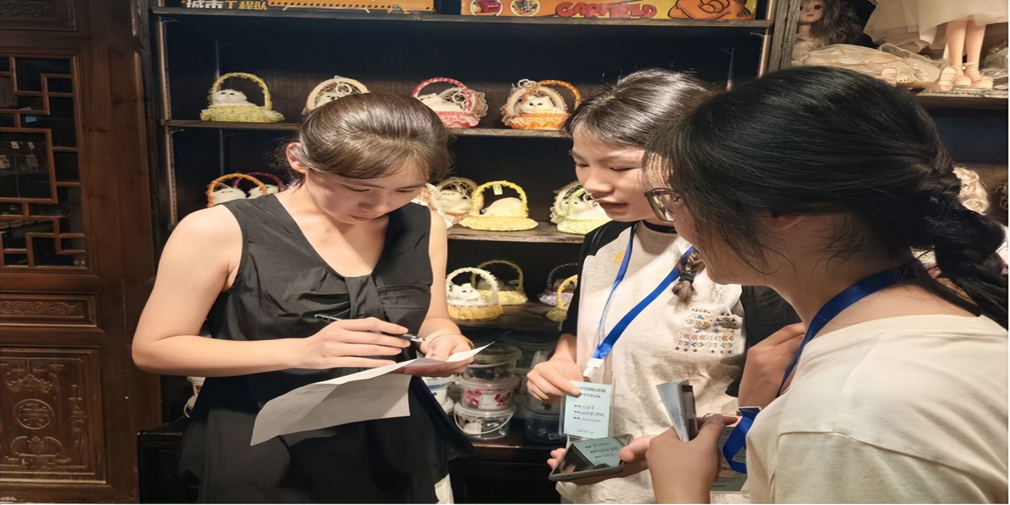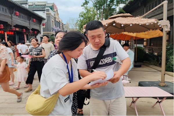 在调研过程中,一支小队的成员对祥云湾景点内的汉服店工作人员进行了问卷调查。队员们手持问卷,专注倾听,与被访者诚恳交流。通过调查,队员们了解到被访者希望景区内的各个打卡点能够合理布局,满足游客的参观需求。这一反馈为景区的进一步优化提供了宝贵的建议。