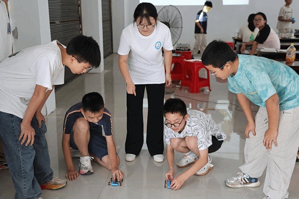 实践操作环节中的小车竞速赛备受关注。孩子们自由分组,领取材料包后,先由志愿服务队队员介绍材料包并示范组装流程,随后便分组协作动手操作。孩子们专注于小车的搭建与调试,现场洋溢着浓厚的探索氛围。当自行组装的小车顺利完成竞速时,孩子们的脸上露出自豪的笑容。