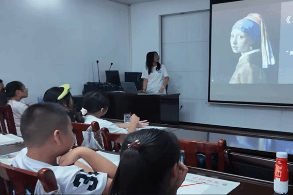 课程伊始,志愿者崔恬老师以精选世界名画开启孩子们的艺术视野。从达・芬奇《蒙娜丽莎》有着神秘且永恒的微笑,到维米尔《戴珍珠耳环的少女》呈现出静谧温柔的光影层次,这些经典画作引领孩子们沉浸于世界艺术魅力中。崔恬老师顺势抛出提问:“如果土家的吊脚楼、西兰卡普、咚咚喹也变成名画,会是什么颜色?”话音未落,台下小手齐举,课堂瞬间沸腾。