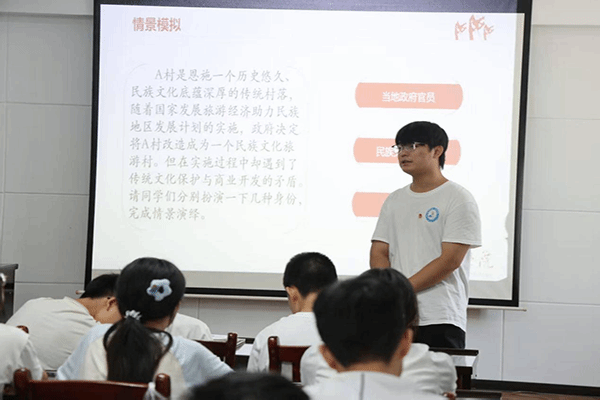 课堂上,孩子们与路老师的互动频繁而融洽。在模拟恩施A村搞民族文化旅游如何平衡发展的小游戏中,孩子们积极扮演“当地政府官员”“民族文化传承人”“旅游开发商”“游客”等角色,孩子们针对恩施文化旅游开发问题展开热烈讨论。路老师在一旁引导,并鼓励孩子们大胆表达想法,让孩子们在互动中深刻理解发展的意义,让孩子们明白“各民族共同繁荣”的深刻含义。