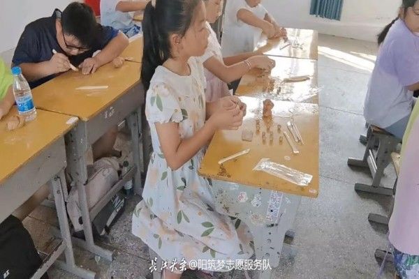 团委网7月8日消息(通讯员 吴业彤 报道)“老师快看!我的小泥人穿上‘盔甲’就能站岗啦!”7月8日清晨,崇阳县港口乡洞泉小学五年级教室传来阵阵欢笑声。武昌理工学院崇阳筑梦志愿服务队化身“泥土魔法师”,志愿者吴业彤带领42名乡村少年开启奇妙陶艺之旅,让孩子们在指尖翻飞间触摸千年陶艺魅力。